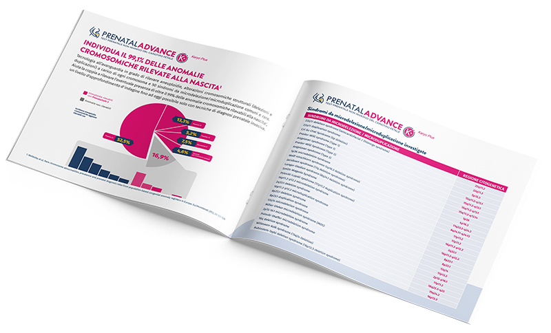 Tecnologia all’avanguardia in grado di rilevare aneuploidie, alterazioni cromosomiche strutturali (delezioni e duplicazioni) a carico di ogni cromosoma e 50 sindromi da microdelezione/microduplicazione comuni e rare. Aiuta la coppia a rilevare l’eventuale presenza di oltre il 99% delle anomalie cromosomiche rilevabili alla nascita1, un livello d'approfondimento d'indagine fino ad oggi possibile solo con tecniche di diagnosi prenatale invasiva.